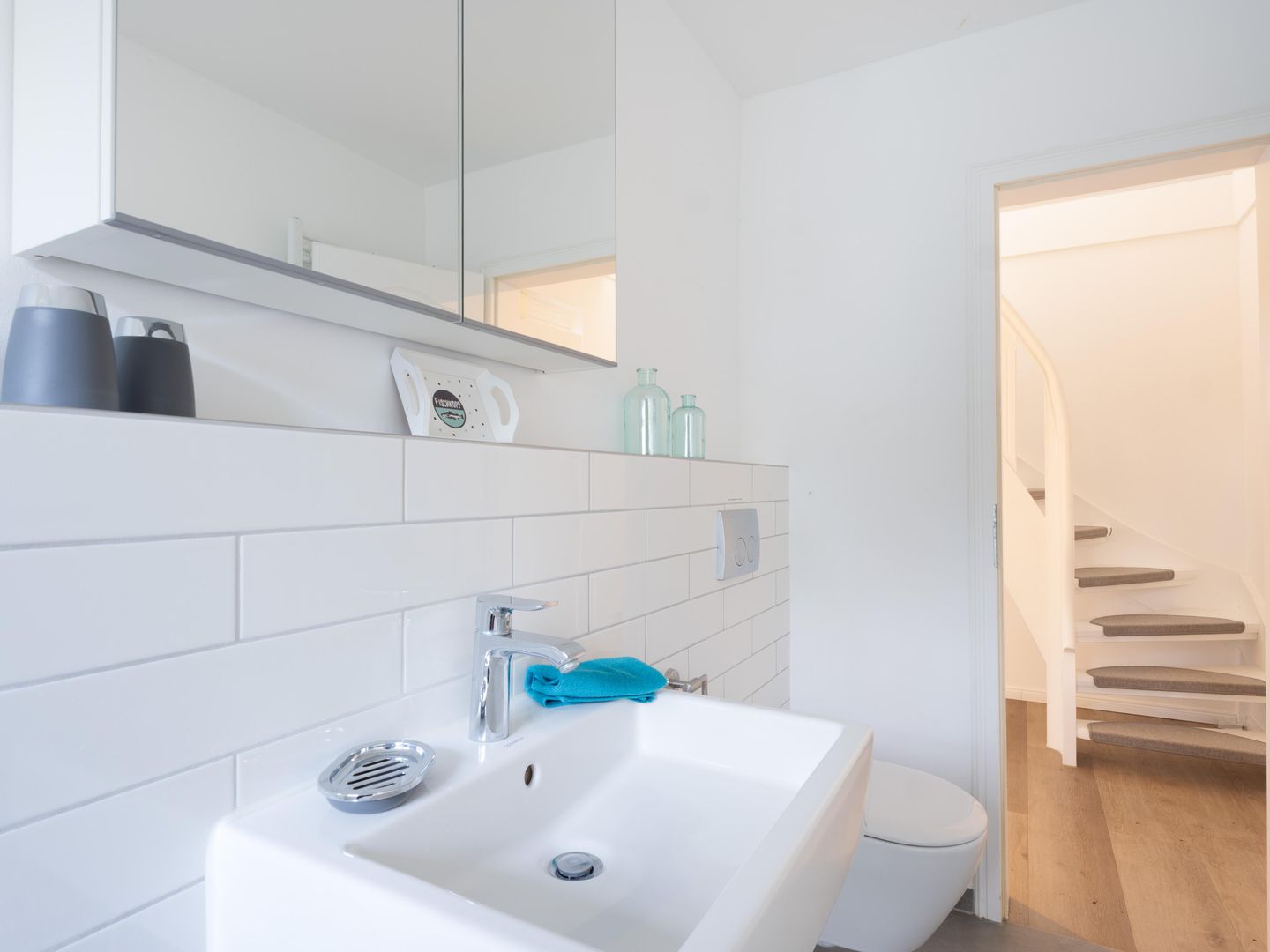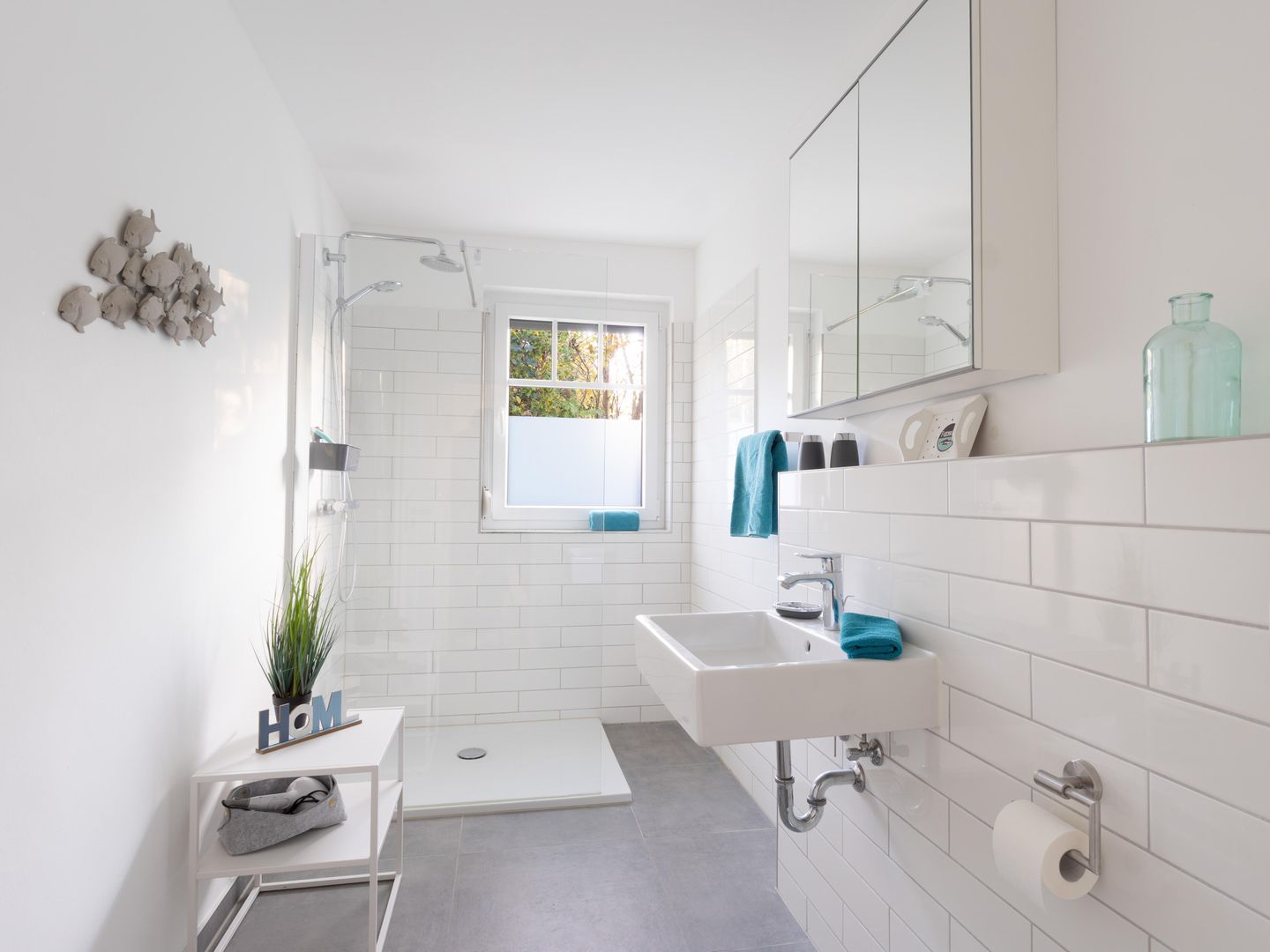Das stilvolle Duschbad mit ebenerdiger Dusche befindet sich im Erdgeschoss und sorgt für zusätzlichen Komfort.