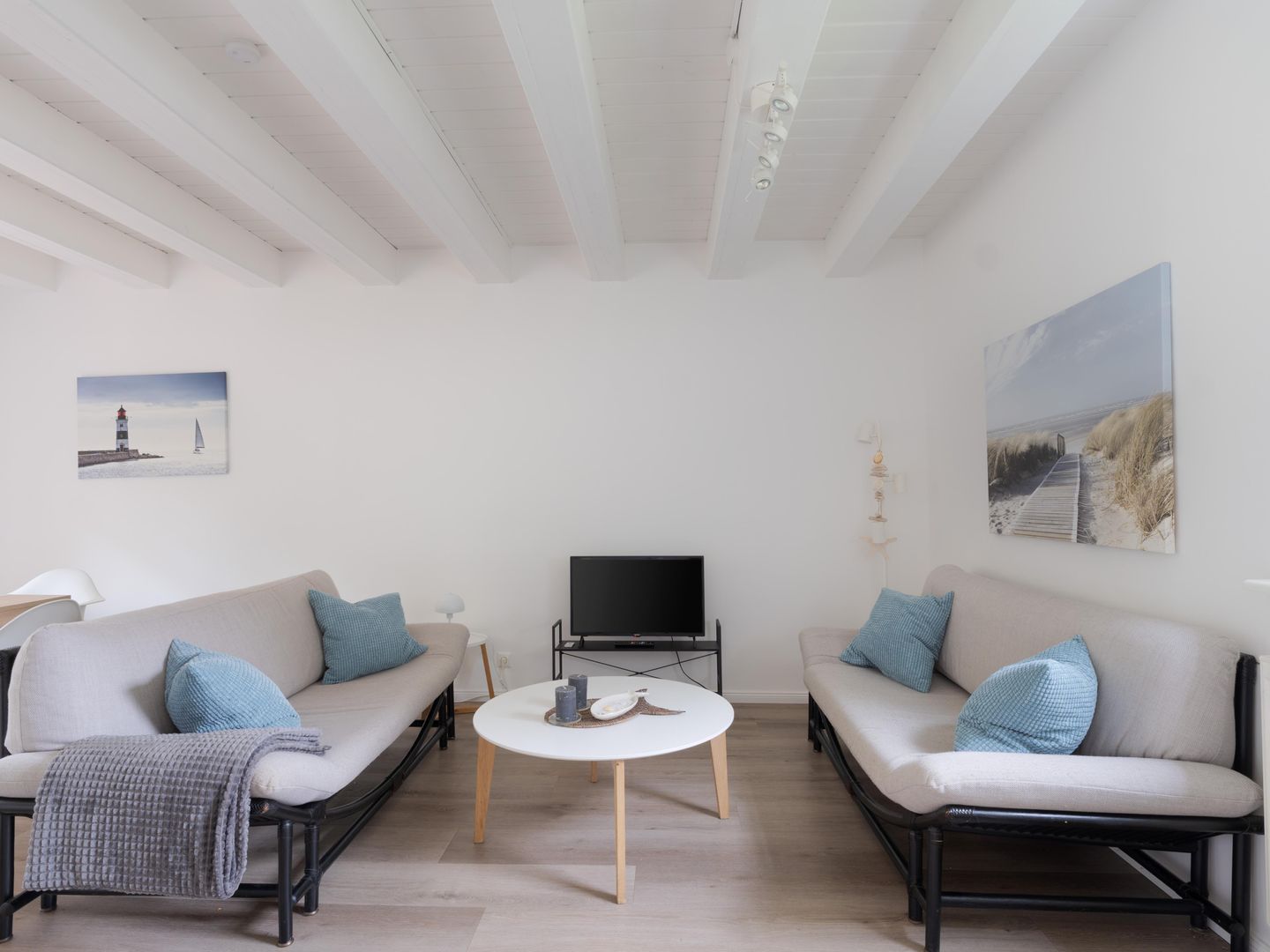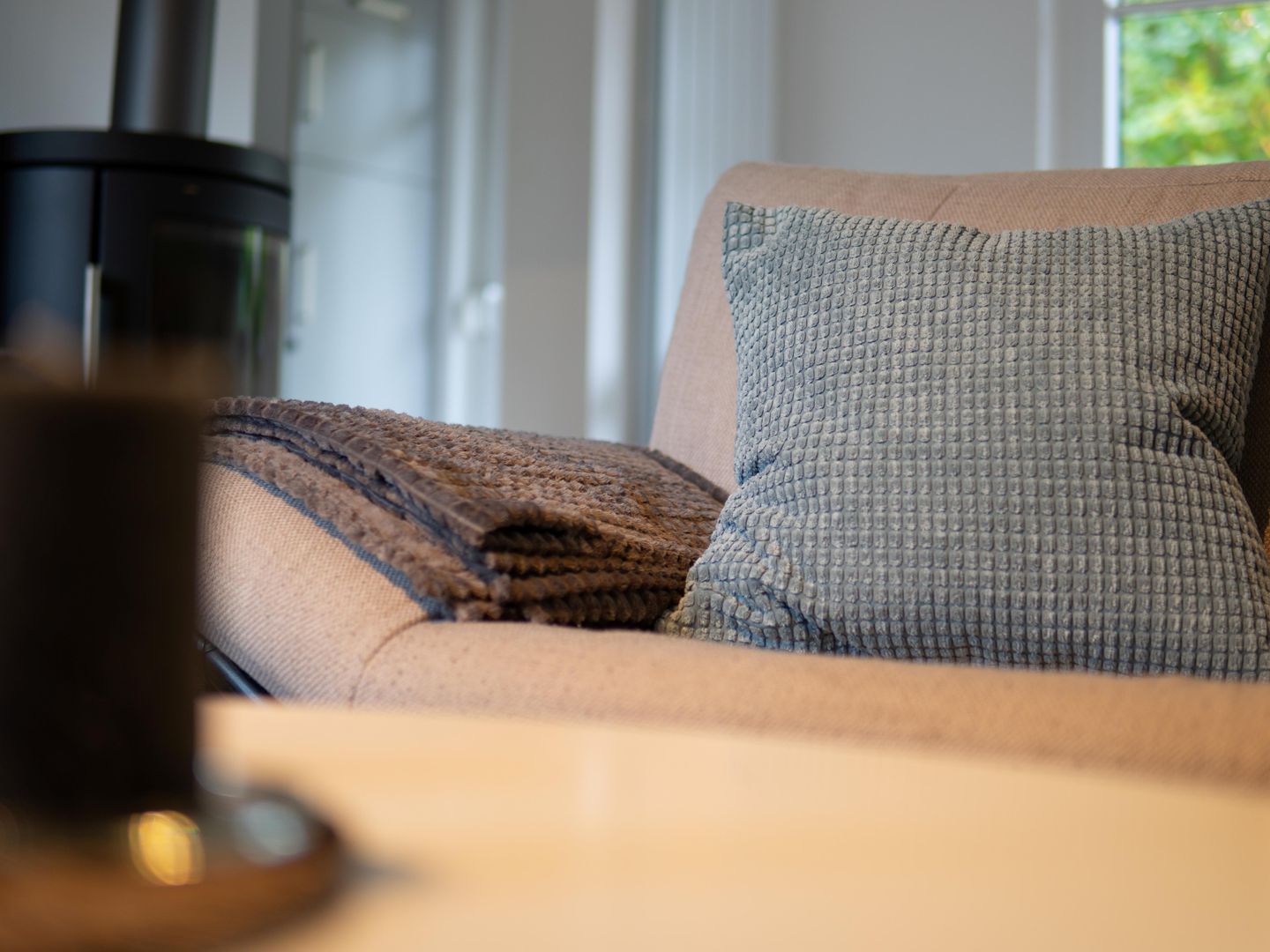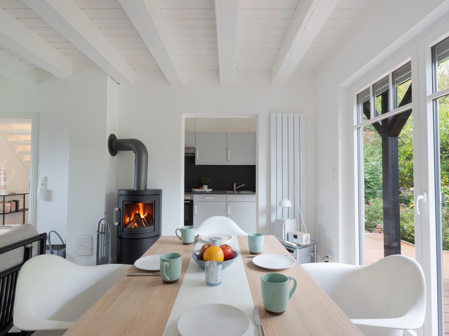 Der Zugang zum Ferienhaus erfolgt über einen einladenden Eingangsbereich, der in einen kleinen Vorflur mit direkter Verbindung zur offenen Küche und dem lichtdurchfluteten Wohnzimmer führt. Dieses ist gemütlich mit zwei bequemen Sofas, einem Fernseher und einem Kaminofen ausgestattet – ideal für entspannte Urlaubstage zu jeder Jahreszeit.
