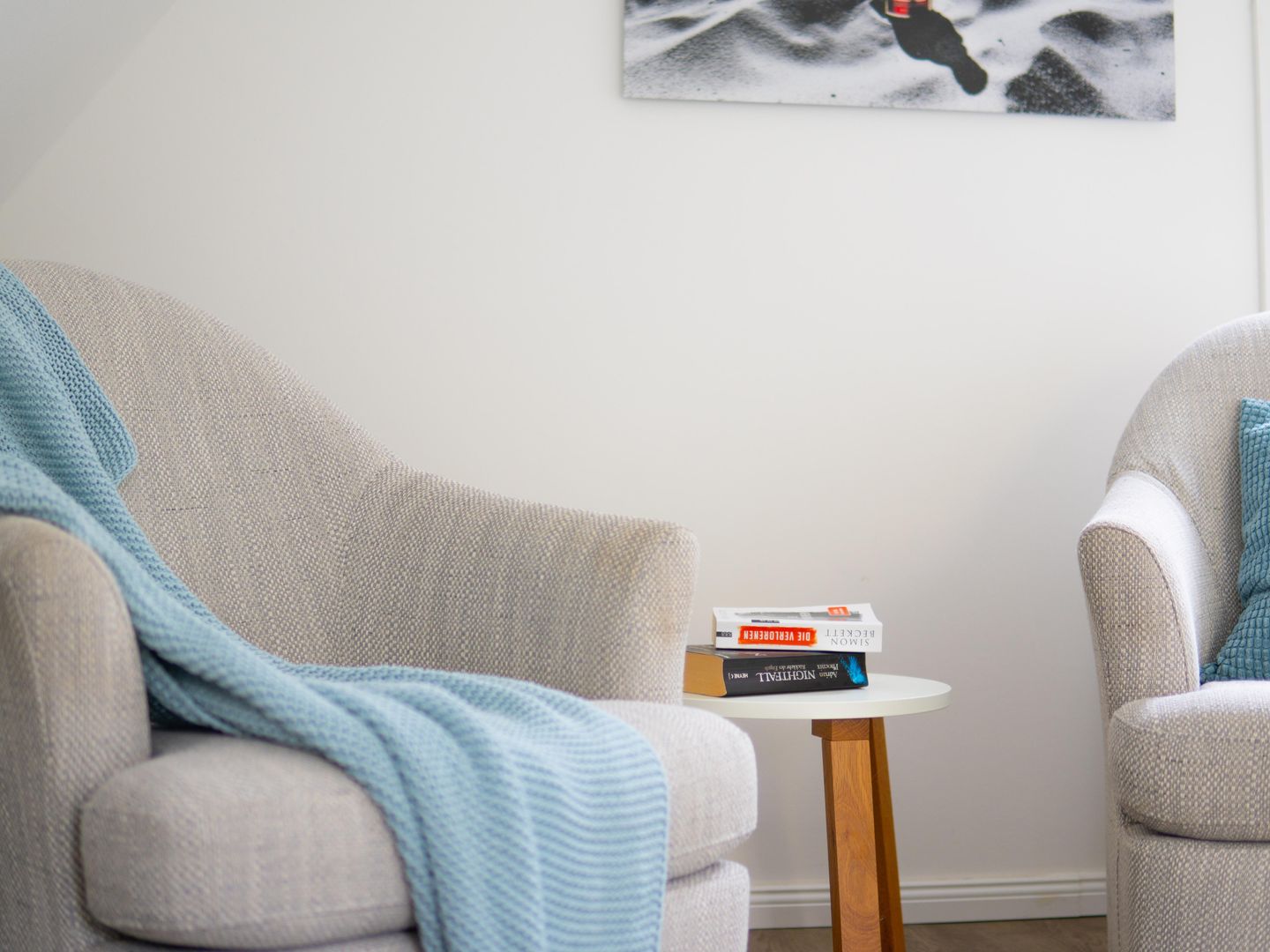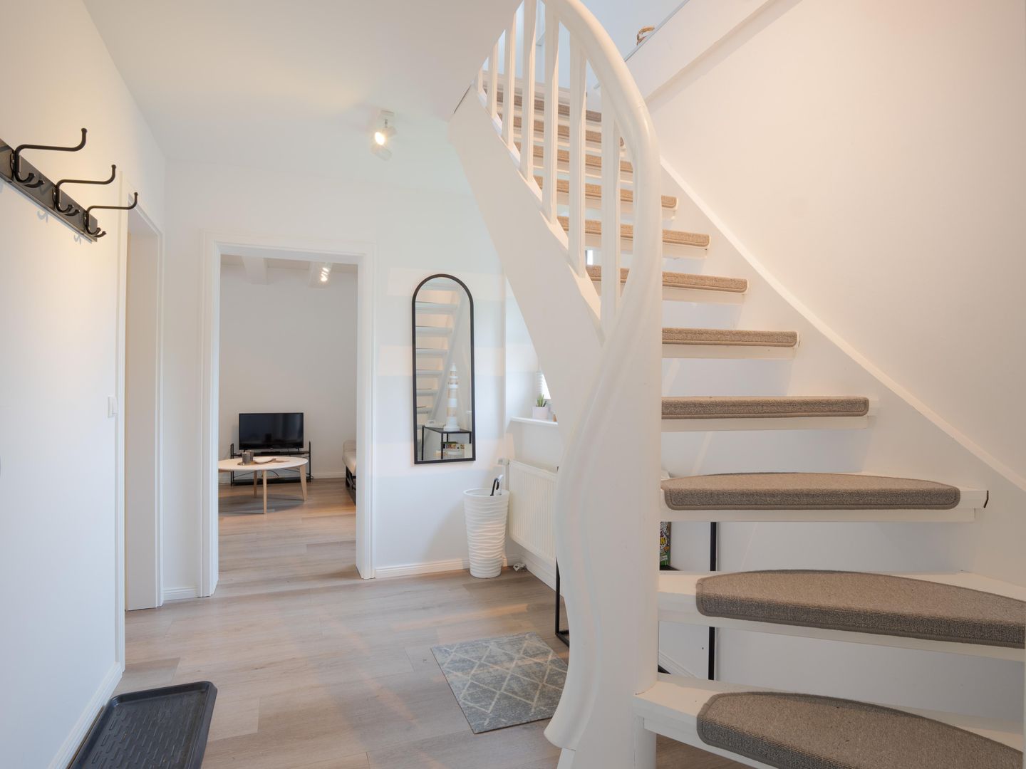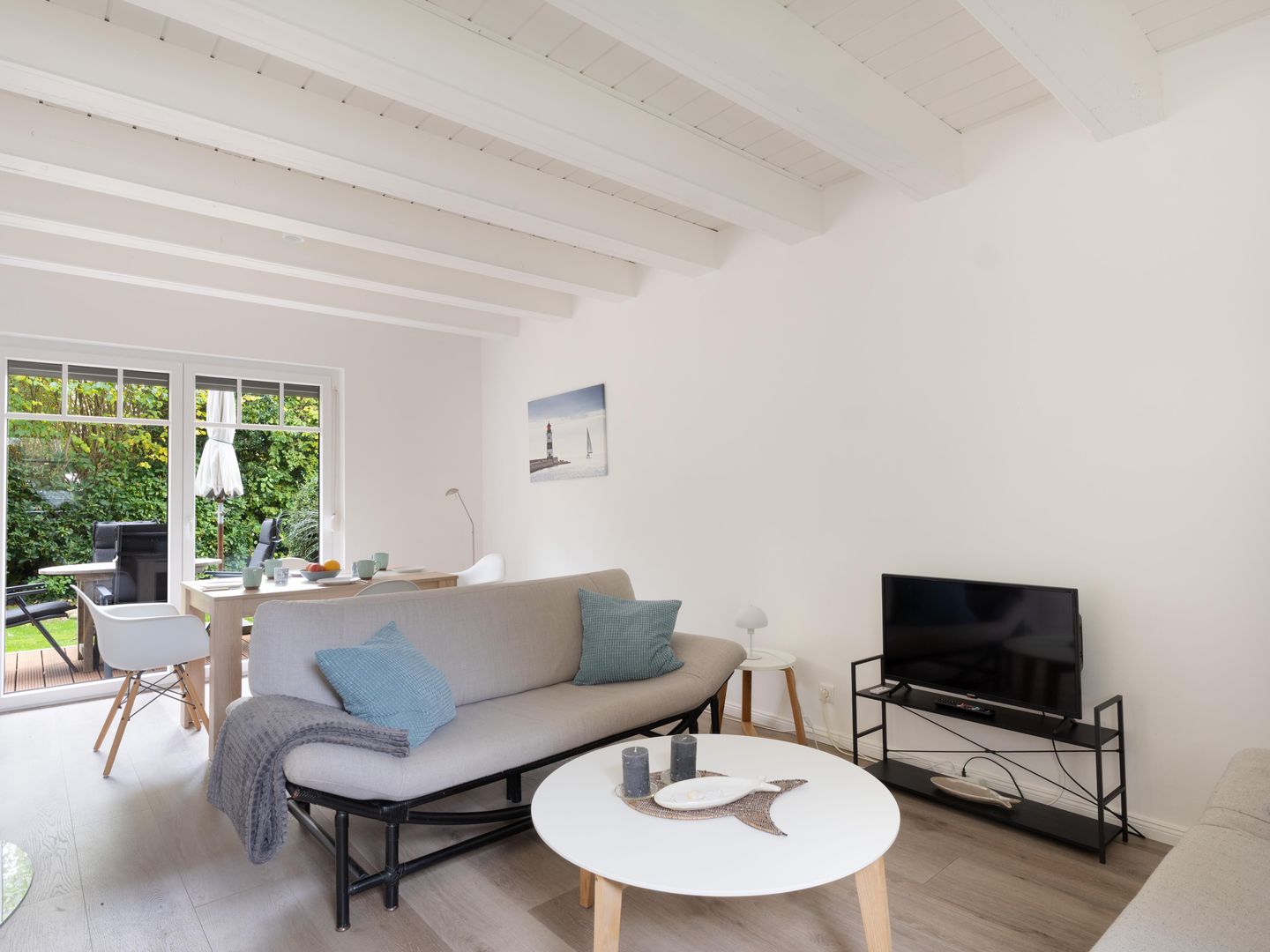 Der Zugang zum Ferienhaus erfolgt über einen einladenden Eingangsbereich, der in einen kleinen Vorflur mit direkter Verbindung zur offenen Küche und dem lichtdurchfluteten Wohnzimmer führt. Dieses ist gemütlich mit zwei bequemen Sofas, einem Fernseher und einem Kaminofen ausgestattet – ideal für entspannte Urlaubstage zu jeder Jahreszeit.