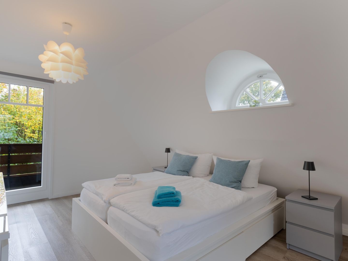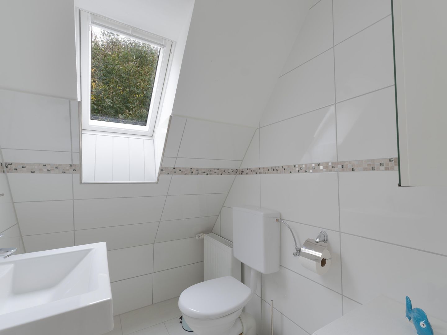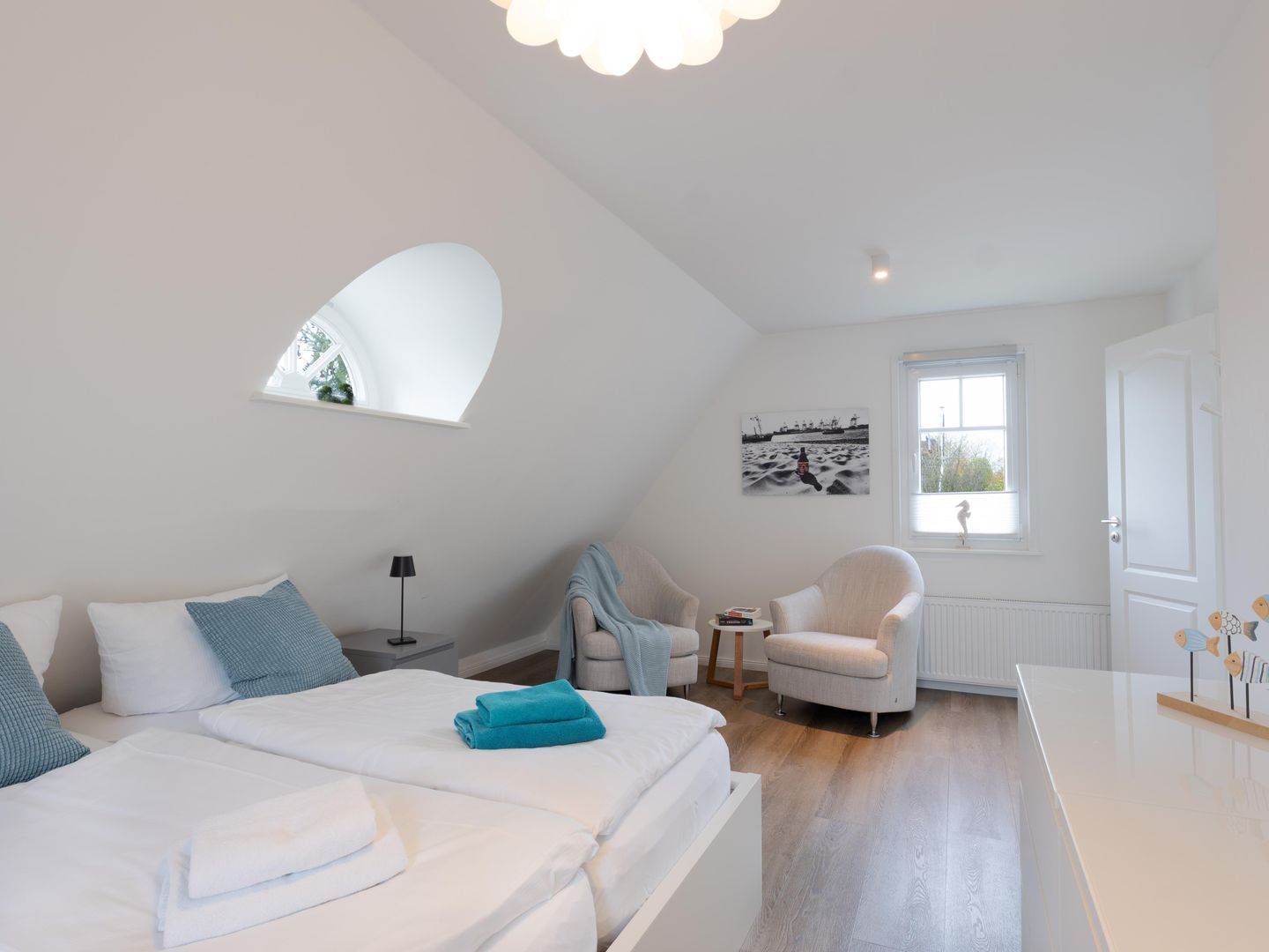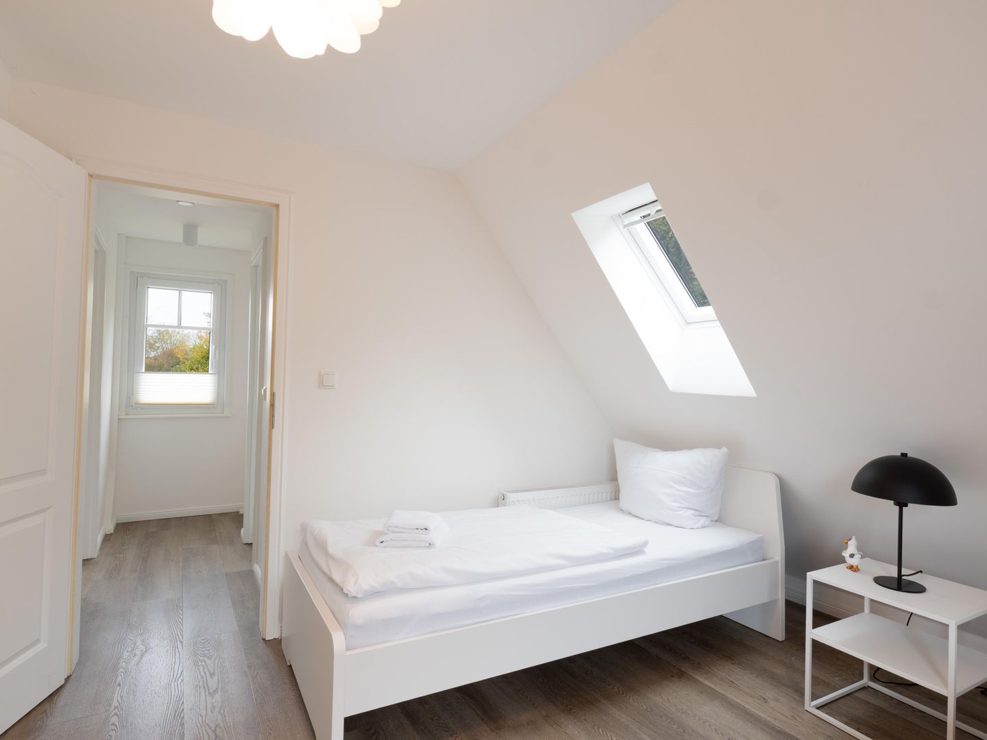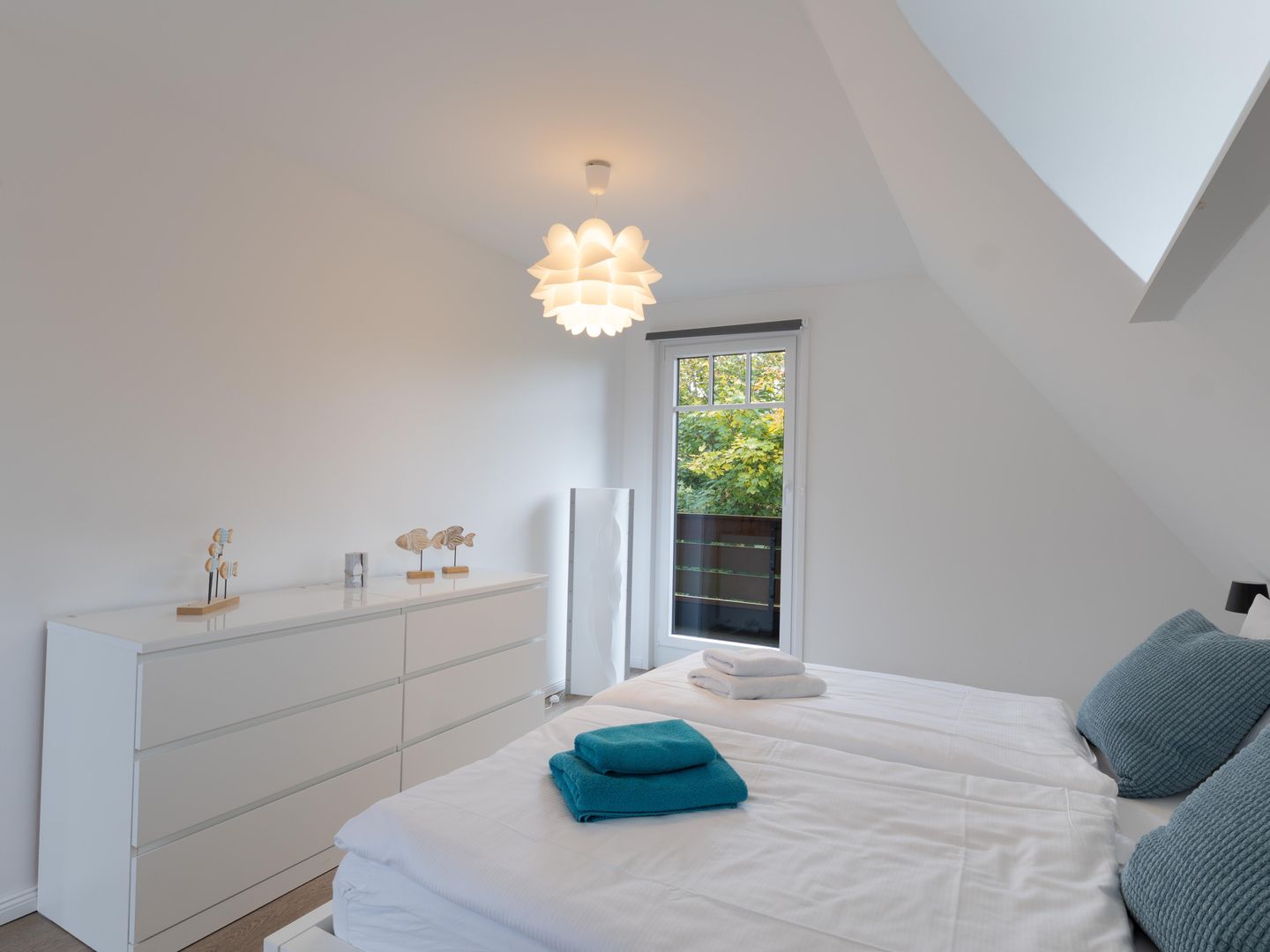 Über eine Treppe erreicht man das Obergeschoss, in dem sich zwei Schlafzimmer befinden – eines mit einem komfortablen Doppelbett, das andere mit zwei Einzelbetten. Ein separates Gäste-WC ergänzt das Raumangebot auf dieser Etage.