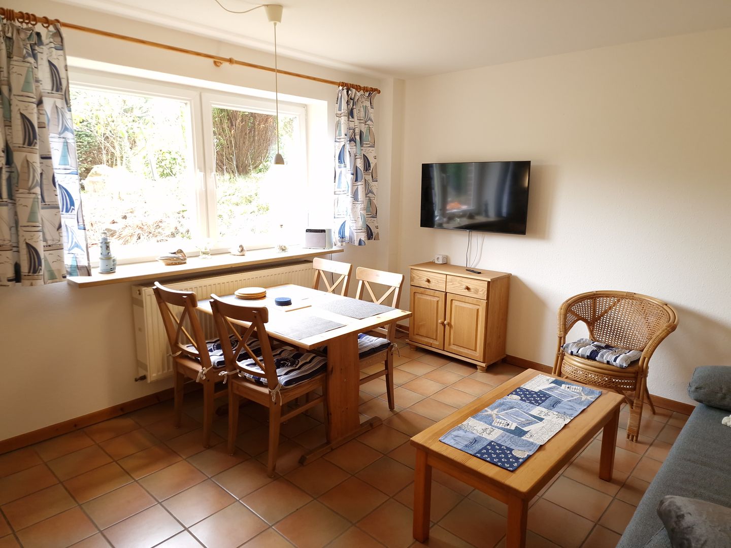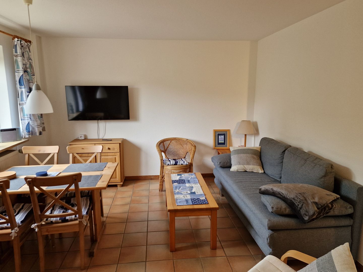 Der liebevoll eingerichtete Wohnbereich ist ideal, um nach einem erlebnisreichen Tag zur Ruhe zu kommen. Ob mit einem guten Buch oder einem Film am Abend – hier lässt es sich wunderbar entspannen.
