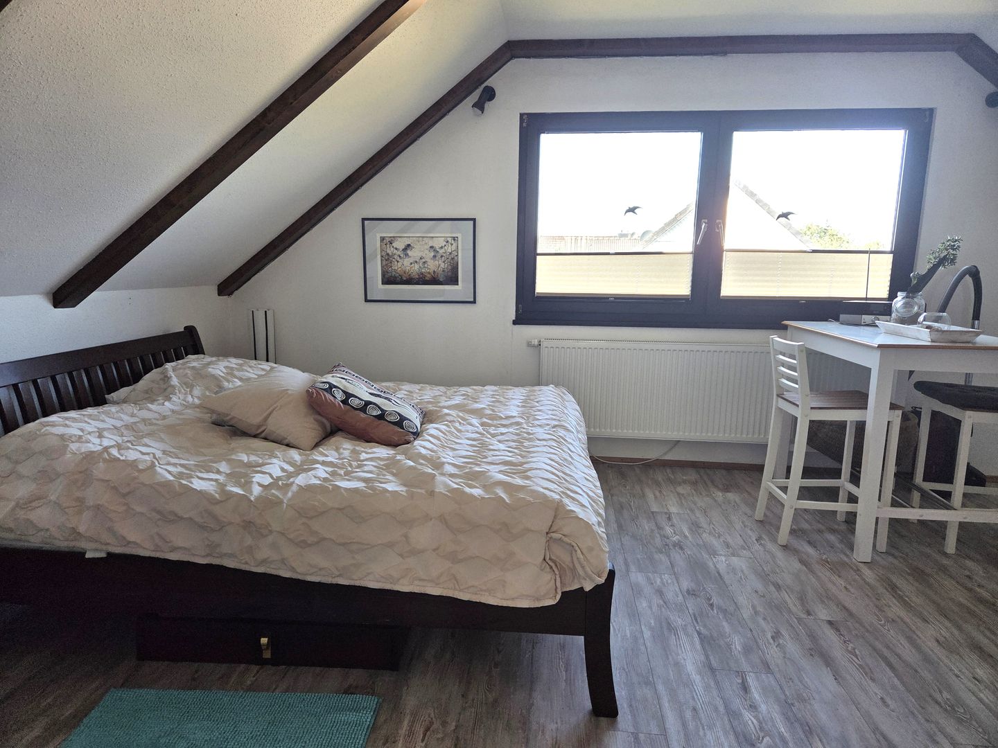 • Großes Schlafzimmer mit Doppelbett (180x200 cm), Badewanne, Waschbecken, Sportmatte und Fliegengitter